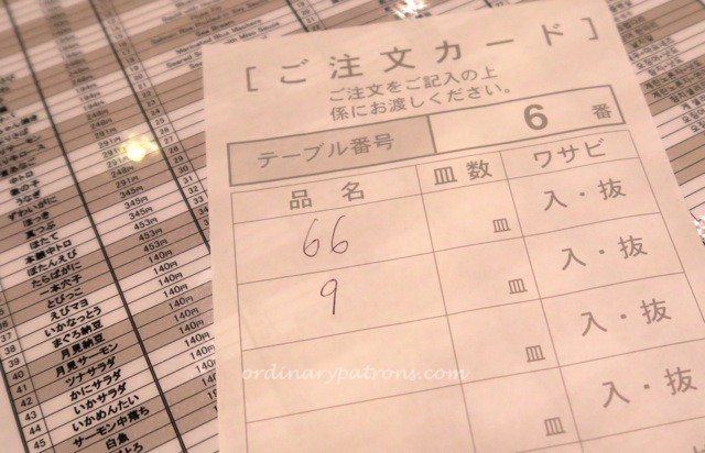 Let me say straight away that you should not expect high-end gourmet sushi here at Hanamaru. What you can expect is good sushi here at really reasonable prices. More like BMW 5 series rather than Rolls Royce quality, to use a car analogy, which is fine for us, ordinary patrons. The place is filled to the brim with mainly locals but some tourists are also spotted. The sushi chefs do not speak English, but that is not a problem here as you can simply take what you want from the belt. You can also place orders by referring to the English menu and writing the item number that you desire on the slips of paper provided. Prices range from around 140 to 500 yen per plate. The plates are colour-coded according to price.