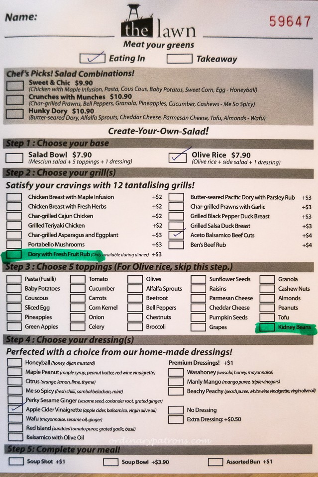 It is essentially a self-service restaurant. You help yourself to the cutlery and water. You design your own meal by filling in a form ticking off various combinations of items. Hand over the form to the cashier at the counter and pay. You will be given a buzzer device while your food is being prepared. The area where you are filling in the form and the cashier’s counter are right next to the place where the meats are being grilled. That may give you some incentive to quickly decide what you want to eat as otherwise, despite the fume extractor, the smell of the grilled meats may soon cling on to your clothing and hair.