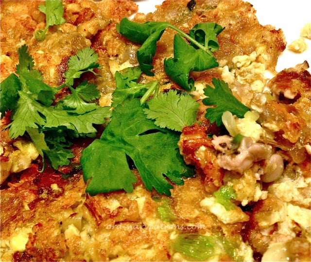 Or luak (in Teochew) or “or chian” (in Hokkien) literally means stir fried oysters in either dialect. Â It is quite a popular local dish in Singapore, but not as commonly found as top hits like char kway teow or chicken rice. The main differences between the Teochew version and the others are quite subtle but to us they make a lot of difference. The first is the use of tapioca flour into the mix, thereby creating a gooey texture for the omelette. The second is the type of oyster used are usually of a smaller species, which means that they can be more evenly spread out and the taste evenly distributed. The last thing is the topping of Chinese parsley, which for some reason we associate with Teochew cooking.