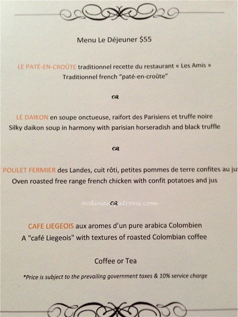 At our last visit to Les Amis, we had tried their mid-tier set course lunch which costs $70 per pax. We had received queries about their basic set lunch which is even more affordably priced at $55. Our friends were wondering whether you will still enjoy the Les Amis-ness of the restaurant at their lowest cost offering or will it be a bare bones, poorer cousin experience. So when the opportunity next arose to dine in the area, we were at Les Amis to test drive their reasonably priced offering, Menu Le Déjeuner (The Lunch Menu).