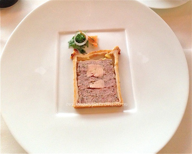 The first course was the traditional French pate-en-croute – pate baked in a mould made of pastry so that it becomes “pate in crust”. The dish was so plainly plated yet beautiful in its simplicity of presentation. The rectangular shape of the pate and crust was nicely framed by the indented shape of the plate like a painting. It provided a smooth and creamy start to the meal. The pate was lightly flavoured and did not feel heavy at all.