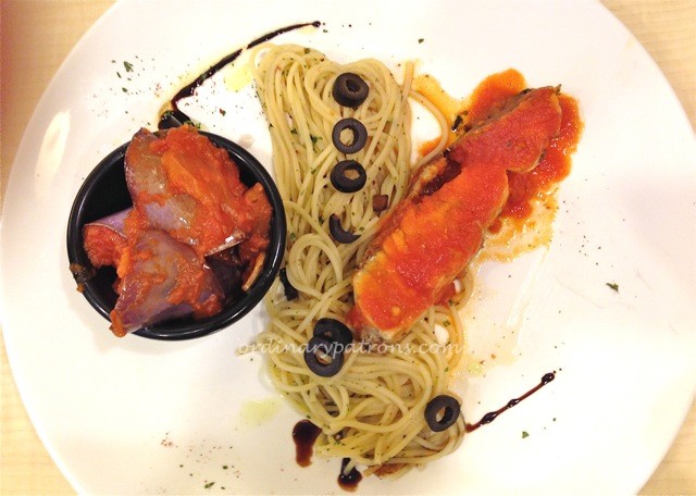 The restaurant is very simply decorated. Most of the seating is in the open air area. There is an air-conditioned area which houses the kitchen and a cramped dining area which had a few small tables. Unless it is really hot, it is more comfortable to sit outside than the inside as the conveyance of food and other supplies will take place around you as you eat. At lunch time, Eggs & Berries is quite a popular place and there was a short queue forming soon after we arrived. At a price of $7.50 per person you can design your own lunch by combining the choice of the main item together with pasta or rice and the vegetables to go with your meal on the side. We selected two different combinations – the braised beef bourgougnon, spaghetti with sauted broccoli and the pan seared seabass, spaghetti with braised aubergine.
