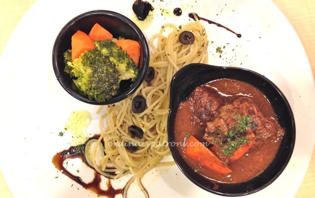 At the price of $7.50 which is not much more than food court prices, we had quite low expectations. The dishes turned out better than expected. Of course they were not gourmet quality but were decent well cooked dishes. The beef bourgougnon was flavourful and soft. The broccoli and carrots were cooked just enough with some crunch. Very often, vegetables that come with set meals are cooked to death and mushy. This was not the case here. The seabass was well cooked and with one side seared till golden brown. The aubergine was a good accompaniment. I should say that the portion of pasta was small. You will certainly not be full if you have an average appetite. You have an option of adding on some extras like a soup or dessert at a small extra payment (I think it was either one or two bucks more). But, inspired by the wisdom of our former prime minister, we actually thought that being 80% full was good enough. In fact I think this already has more calories than we needed. So I would regard the small portions were a positive rather than a negative.