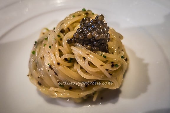 The signature cold angel hair pasta was a simple dish that was really special. It looked inviting with the pasta glistening in olive oil with specks of black truffle and topped with Oscietra caviar. The pasta was perfectly done – tender with a slight firmness. The dish was full of flavours and delicious.