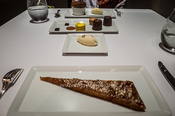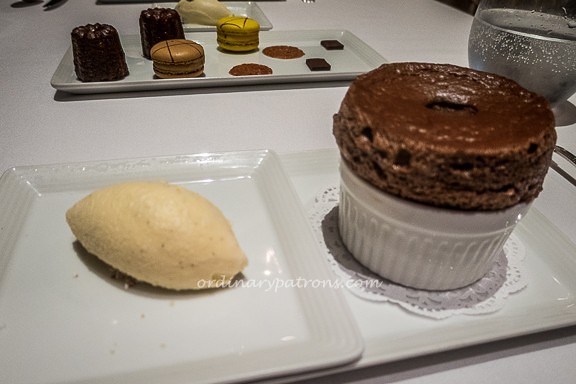 We ordered a chocolate souffle ($15) and an apple tart ($15) for desserts. A complimentary petit fours platter, which included canele and macarons, was served. The souffle was nicely puffed up and fluffy and very enjoyable with the ice cream. The crispy fine apple tart was delightful with the rum & raisin ice cream. It was a great way to end an interesting and satisfying dinner.