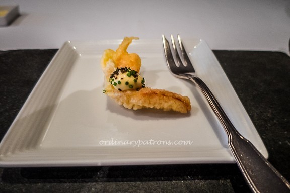 We ordered 3 starters to share – the signature cold angel hair pasta with caviar ($80) from the menu, and grilled scallops ($33) and goose egg with black truffle ($97) from the special platter. For our mains, we had the special grilled tuna ($90) and the squid ink flavoured rice with abalone ($38) from the menu. The complimentary amuse-bouche was tempura prawn. Each dish was nicely plated and served promptly.