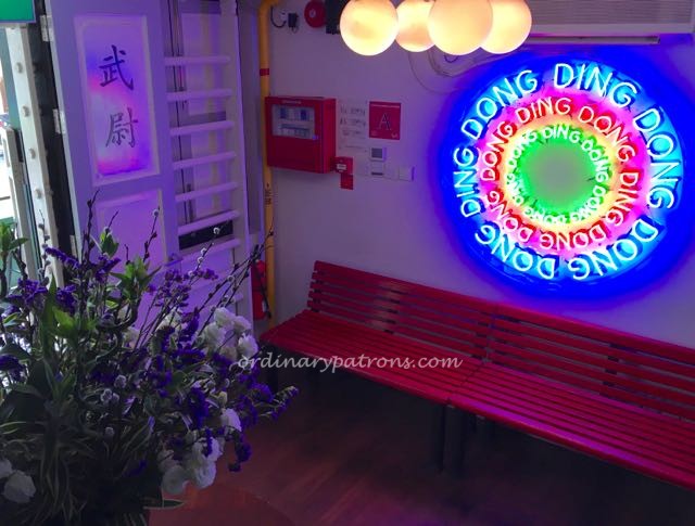 Situated in a small, restored shophouse on Ann Siang Road, Ding Dong Singapore is the bumble bee of restaurants. Like the bumble bee, it should not be able to fly. Its separate components do not seem promising – a silly name, sleazy neon lights that will not be out-of-place in a less desirable part of town, a very cramped space, high bar tables with uncomfortable stools for seating and weird food concoctions. Despite (or perhaps because of) all these elements, Ding Dong Singapore manages to fly and has been doing so for a few years!