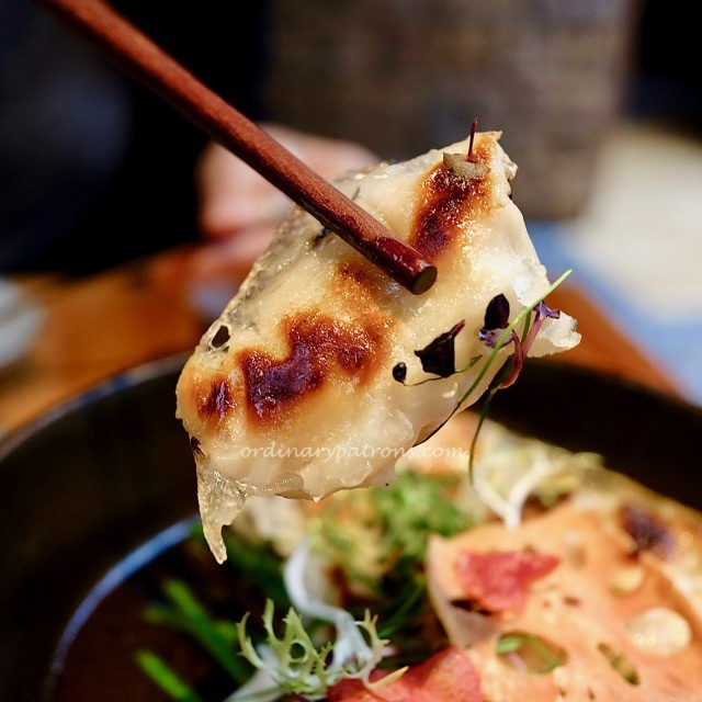 The gyoza was the best dish of the day. The skins were thin but resilient, giving them a nice chewy texture but with a crispness on the browned  surfaces.  The vinaigrette sauce was very good.