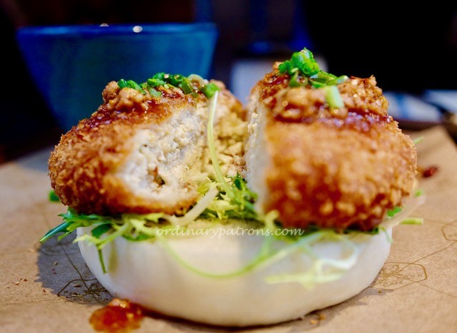 Birds of a Feather serves the usual cafe food, but with some twists that reflect their Chinese origins. Here are pictures of the lunch, small plates and dinner menus. We ordered a tofu burger with mapo sauce ($22), Â fried potato and sweet potato ($8) and crispy gyoza in truffles soy vinaigrette ($16).