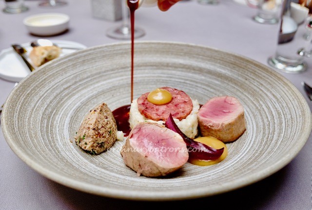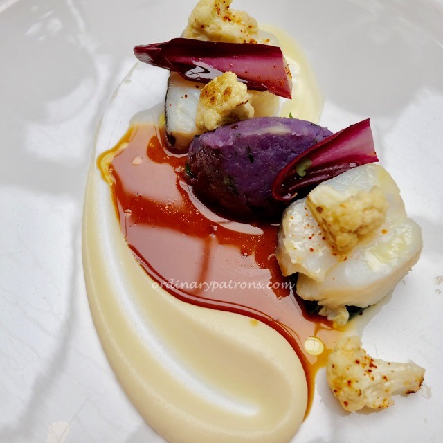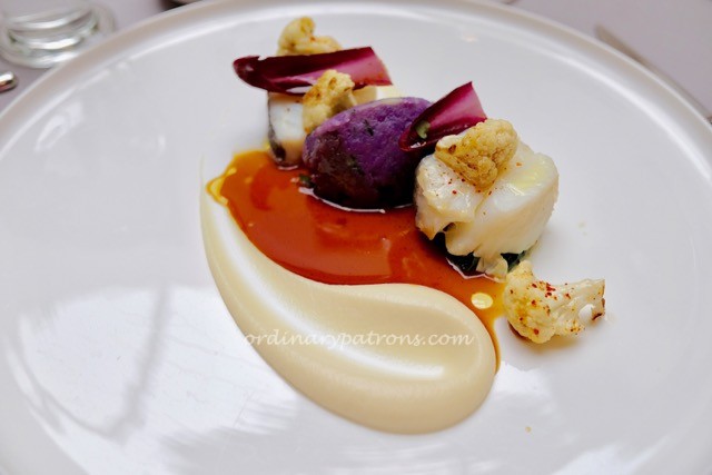 The salt cod and cauliflower dish was presented in a unique way. The white chocolate and chicken jus intertwined to form an attractive shape. The combination of different tastes was successfully done. Both main courses were very good.
