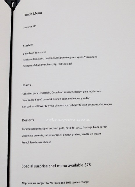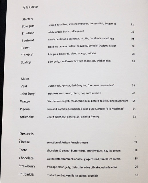 At lunchtime, Rhubarb Singapore serves a $45 3-course set lunch. This sounds quite reasonable for a one Michelin star French restaurant in Singapore. There is also a more expensive $78 surprise chef menu. Here are pictures of the lunch menu, the ala carte menu and a page from the wine list.