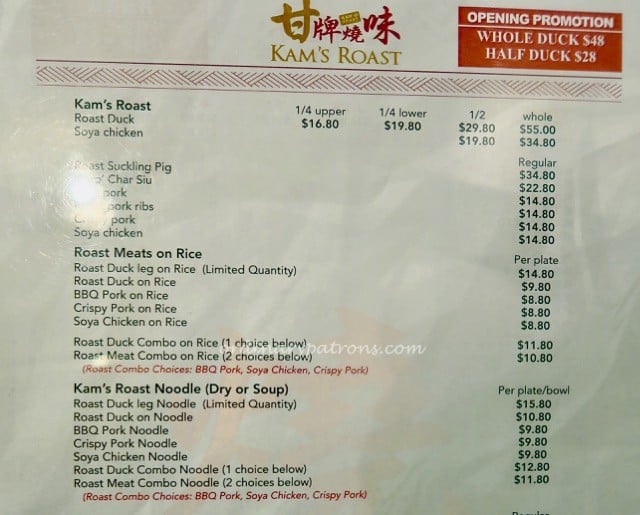 Here are pictures of the Kam’s Roast Menu. ย The roast meats are the main attractions – in particular the roast duck, suckling pig and roast pork. ย We placed our order for a half roast duck ($28), wonton noodles ($8.80), marinated cucumber with vinegar and garlic ($6.80), steamed rice ($2) and Chinese tea ($1.50 each).