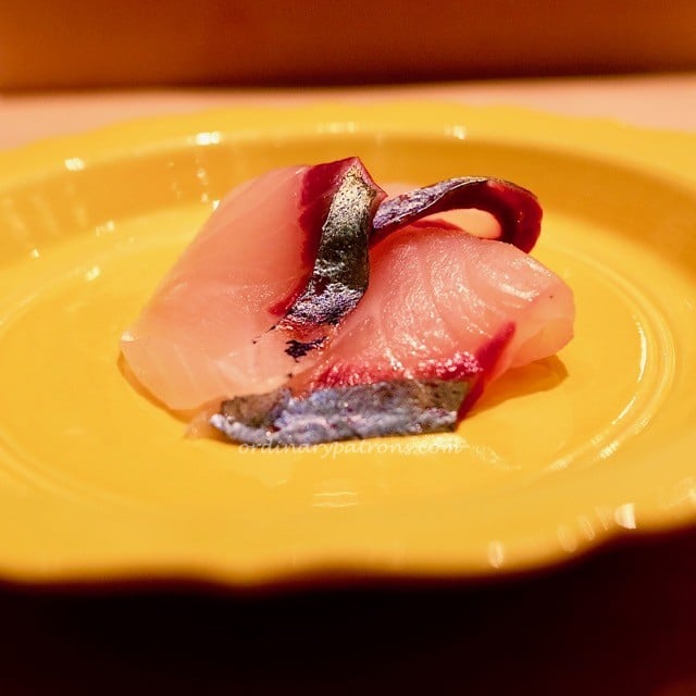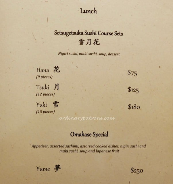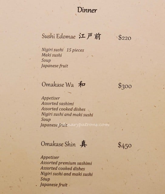 Here are pictures of the Shinji by Kanesaka menus for lunch and dinner. The dinner menus range from $220 to $450. Our dinner that day was a complimentary dinner which the UOB bank extends to some of their customers. We were told that it was a customised dinner course which is quite similar to the $300 Omakase Wa course. Essentially a five-part dinner with sashimi, cooked dishes and sushi as the main events.