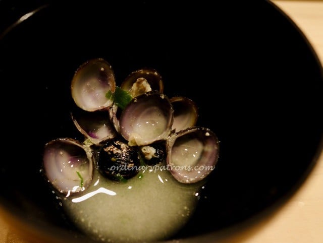 The flow of sushi finally stopped. Each item on the menu was small, but they all added up to make up a substantial meal. It was actually quite a heavy dinner. Next were pickles and a nice bowl of clam soup. The seafood taste was moderate but very pure. I forgot to take a picture at the start. Here is a picture of the clams at the end.