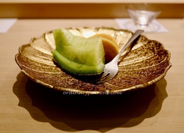 The omakase dinner at Shinji by Kanesaka Raffles Hotel ended with some amazingly sweet musk melon and some less sweet persimmon. Apart from the high quality of food, being seated at the counter with the experienced chef right in front of us made it a superb experience to eat at this wonderful restaurant. He watched the pace of our eating, and prepared the next items so that there was no overload and yet ensured no gap in the momentum of eating.