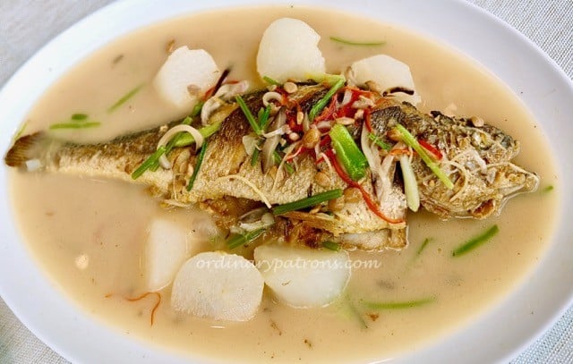 We tried a less usual dish that day. Stewed yellow croaker fish with radish ($28 for a large fish). The large version was a 30 cm specimen. While the steamed pomfret is our default choice at Teochew restaurants, we decided to be different and asked for croaker instead. It was a good choice. The meat was delicate and clean tasting. The broth and accompanying radish were very tasty. We highly recommend this dish.