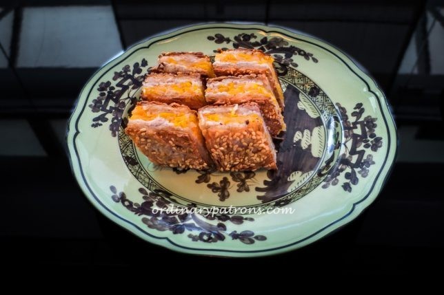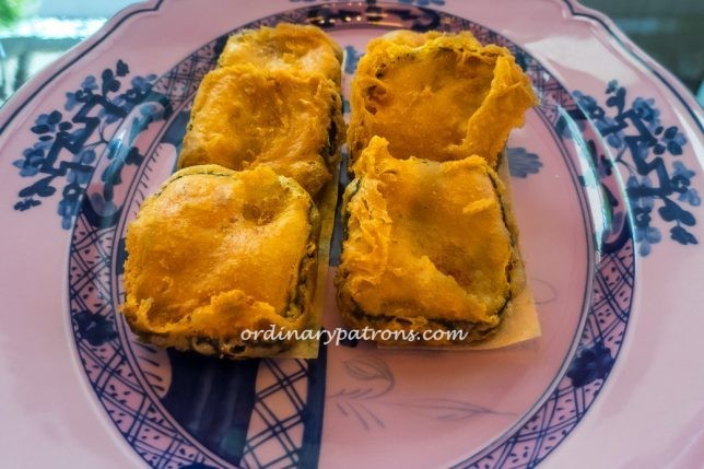 The fried items were more unusual – yam pumpkin and radish cake ($1.80 each piece). The radish cake in particular is very different from those we find elsewhere. One Michelin star chai tow kueh?