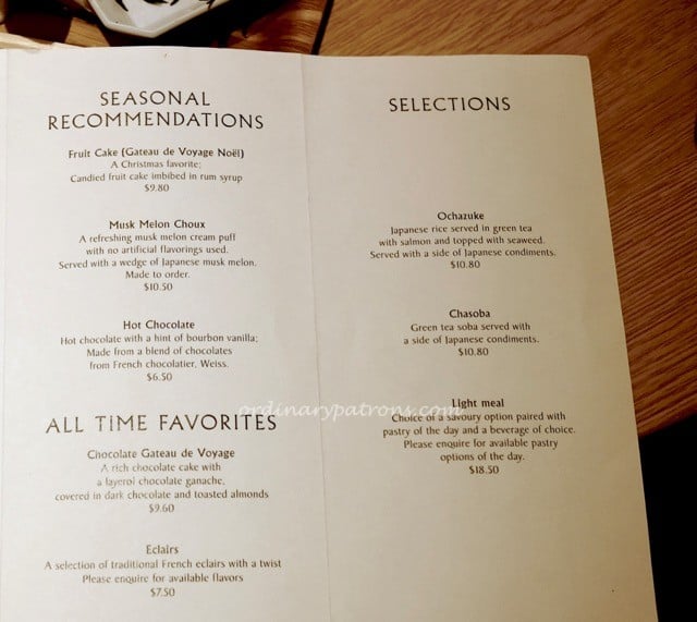 Here are pictures of the Amiral Atelier Paragon menu. As there were only two non-cake items: Ochazuke and Chasoba. It was easy to decide – just try both. There was an option of a light meal which incorporates either choices with a cake and coffee. We decided on a Ochazuke ($10.80) and a Light Meal with Chasoba ($18.50).
