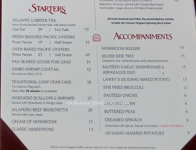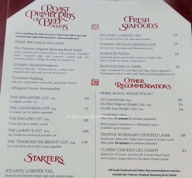 Lawry’s Singapore Lunch Menu