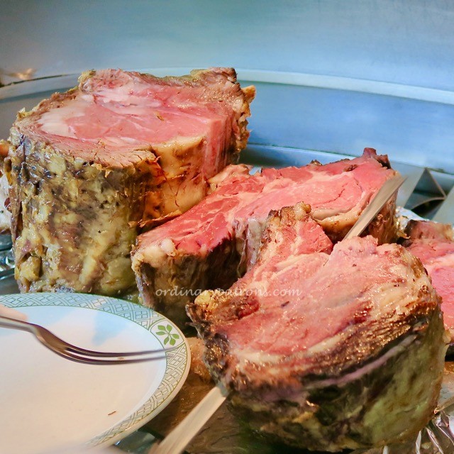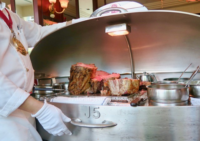 The chef wheels the wagon to our table and proudly displays his wares.  These stacks of delicious looking prime ribs of different ‘doneness’ would make any carnivore weep with joy.  We decide to go with a  medium and a medium-well serving respectively.