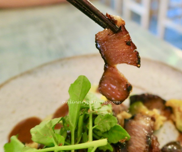Next was the Snake River Farm Kurobuta Char Siew ($24) which was served in a larger portion but still small, almost like an appetiser in a conventional restaurant. These slices of char siew were garnished with a mix of sauces, vegetables and pickles. How does this compare with the common char siew? Â We like the flavour and texture of this pork. The grain of the meat was smooth and even. No fatty bits and yet not dry. Â The sauces added an unusual twist. Â But we miss the charred edges of the common variety.