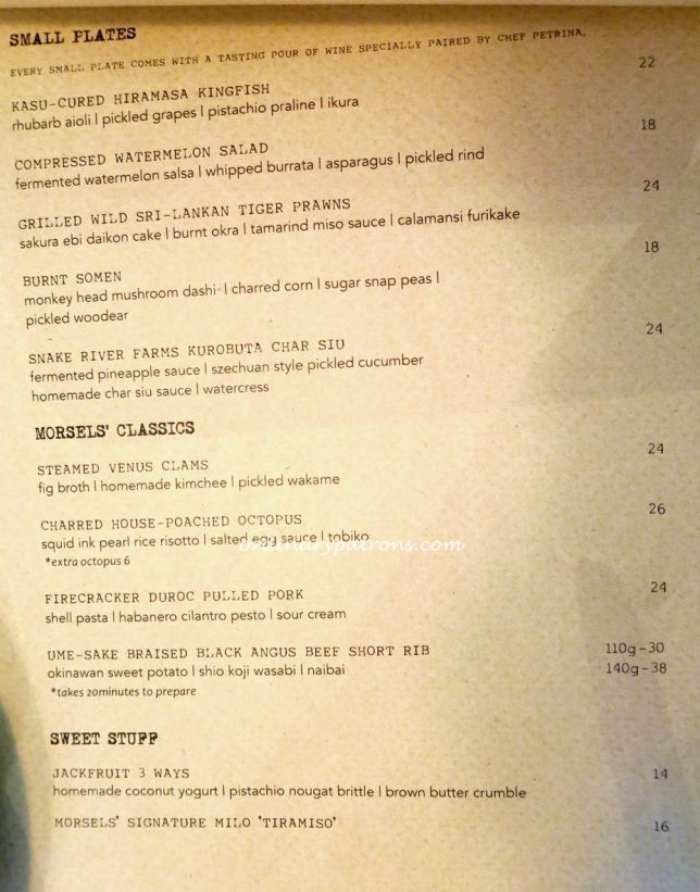 Morsels Singapore is a new small restaurant in Dempsey Hill serving small bites. According to their website, “The 40-seater restaurant founded and run by Chef-Owner Petrina Loh since 2013 serves wildly creative fusion dishes which are ingredient-driven.” Â Morels was previously located in Little India and moved to their current location in Dempsey in January 2017. The description about the restaurant with wildly creative dishes intrigued us. The no-corkage day BYO on Tuesdays sealed the deal for us. We headed to Dempsey Hill, bottle in hand.