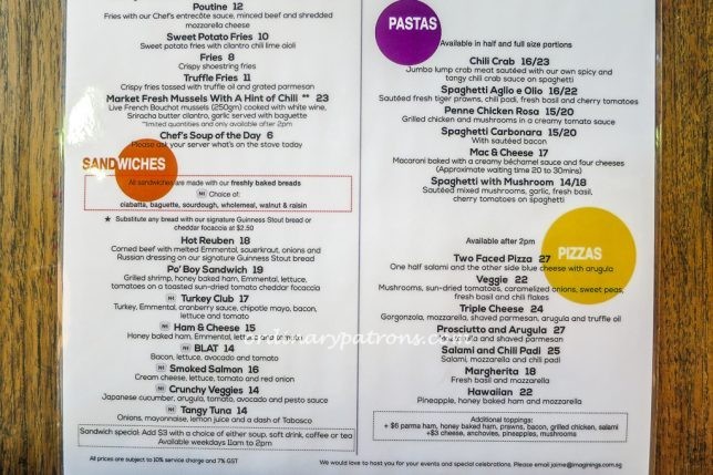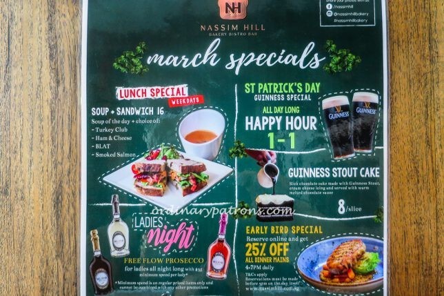The food served at Nassim Hill Bakery Bistro is casual Western cuisine. An attractive feature about this bistro is their early opening hours. There is an extensive all day breakfast dining from 8 am to 4 pm. ย Here are pictures of theย Nassim Hill Bakery Bistro menus for breakfast and lunch. They also have some attractive happy hour, ladies night and early bird deals.
