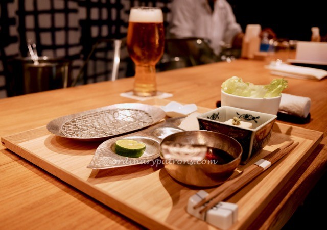 Our tempura condiments were a bowl of tempura sauce, grated radish and half a lime. Â A small tofu and salad appetiser started the ball rolling. Just as sake is the perfect drink at a sushi counter we tend to prefer beer when dining at a tempura counter. At Ippoh, we tried the Sapporo draft ($17 for 500 ml). It was crisp and fresh tasting.