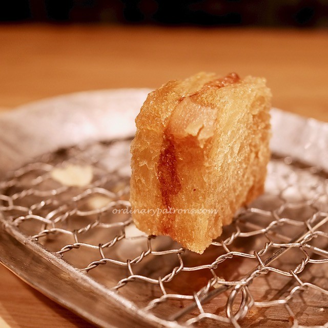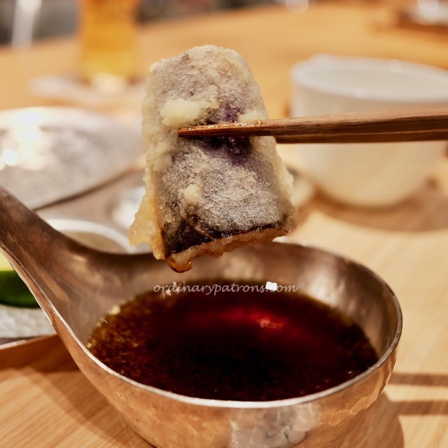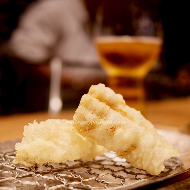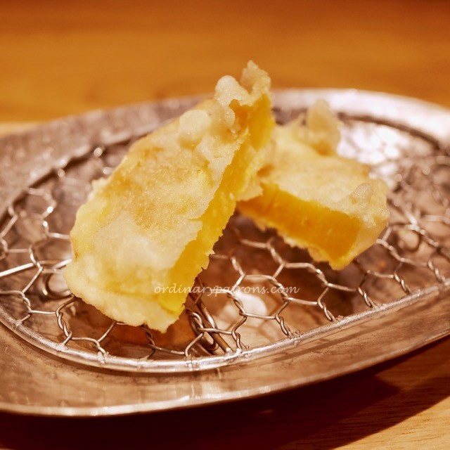 Ippoh Tempura has a special item unlike any other at any tempura restaurant – tempura shrimp toast. This was a deep-fried mini sandwich with some prawn paste inside.  It reminded us of otak sandwiches which has fish instead of shrimp paste.  The final result was very good. Ultra crisp on the outside and the inside part of the bread and paste still white.  The whole thing was not oily.