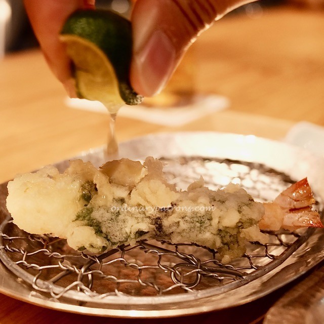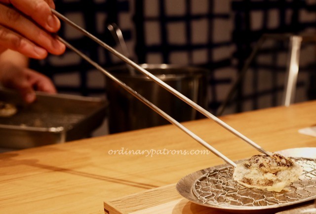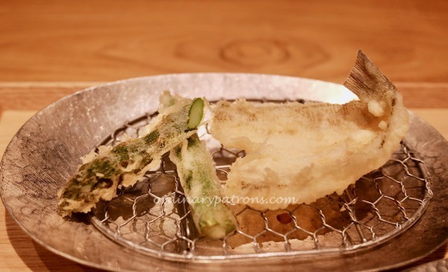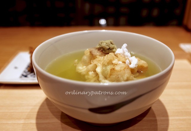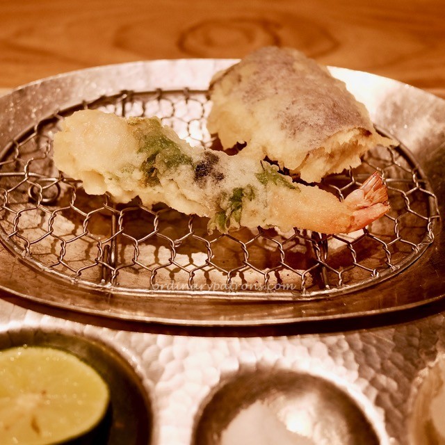 The tempura started flowing soon after, starting with two prawns, the first was a bare prawn, the second was prawn wrapped in a mint leaf. From here onwards, I can’t really remember the sequence of the items, the flow of freshly made tempura continued for about 60 minutes.
