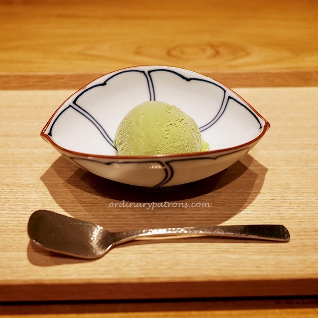 A scoop of green tea brought our tempura lunch set at Ippoh Tempura Bar to a sweet end. Â It was a pleasant meal in the quiet restaurant. We think that the 10 piece meal was quite adequate for lunch. The difference between that and the higher priced Ume course ($100) was a small appetizer and an extra tempura piece made with sea urchin and caviar. Â Our neighbour was having this course. From what we could see the extra appetizer would not tempt us to try the higher priced set, but the last piece of tempura with premium ingredients did look enticing.