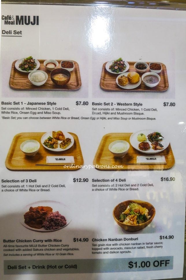 The Basic 3 Deli and 4 and Deli Sets, with bread or a bowl of rice, cost $12.90 or $16.90 respectively. Buy a drink with the set and you get a $1 discount. ย Here are a few photos of Cafe Muji’s Menu.