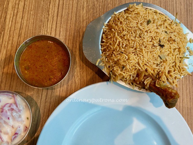 The chicken biriyani was accompanied by a small dishes of yogurt and gravy. Â The untidy pot of biriyani looks small but it holds quite a lot of chicken and rice. Once unpacked onto the plate, it fully filled up the plate.