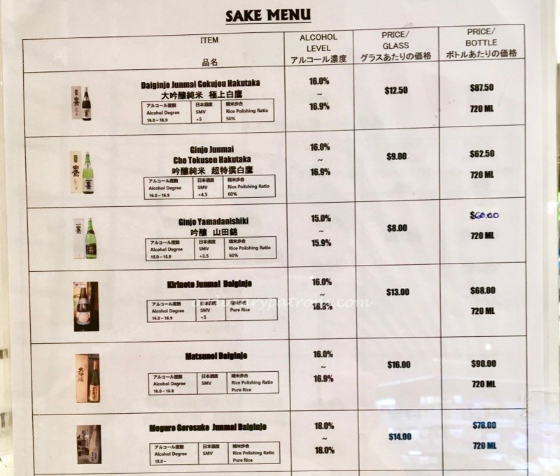 Being seated at the sake bar, I could not resist looking at the sake menu. Basically all the names of sake were Greek to me. The sake is handled by another person at the counter who tried to explain them to me. In the end, we narrowed down the possibilities to the first two on the list – a Daiginjo Junmai ($12.50 per glass) and a Ginjo Junmai ($9 per glass). They were from the same producer, the Daiginjo being made from more polished rice and having a better flavour (was my understanding).
