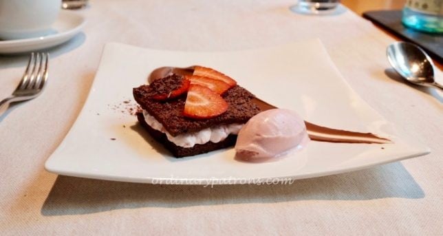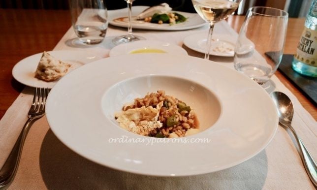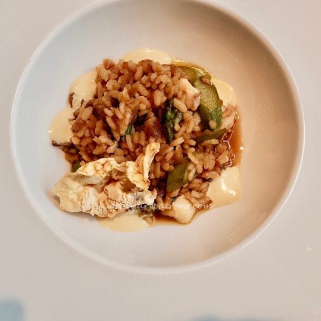 We had the hake with spinach, peppered chickpeas and lemongrass thai sauce and the scorpionfish rice with green asparagus. The hake was clean and fresh tasting. Combining it with chickpeas was a new and successful combination. The fish rice was great – paella style rice with pieces of crunchy fish skins. We asked for less salt for our dishes as we noticed from earlier meals that the food here, especially rice dishes tend to be heavily flavoured. The less salt version was perfect for us.