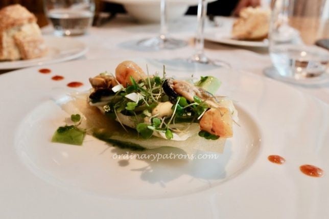There was a five course lunch menu that looked interesting. It costs 35 € including water, bread and VAT. Two other add-ons were available – snacks and cocktail (5 €) and wine pairing (13.90 €). By Singapore standards these prices are downright reasonable. We took the snacks option and ordered wines by the glass (also very reasonably priced).
