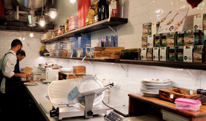 Bodegas 1900 is located in a residential area on the western side of the Barcelona city centre. It is a 15 minutes walk from Plaça d’Espanya, a major train and transport area. The interior is tavern like. There is a “dry kitchen” immediately at the entrance where dishes using the canned items and Iberico ham are prepared. Some seats are available in this area. There is a more tranquil seating area deeper inside the restaurant.