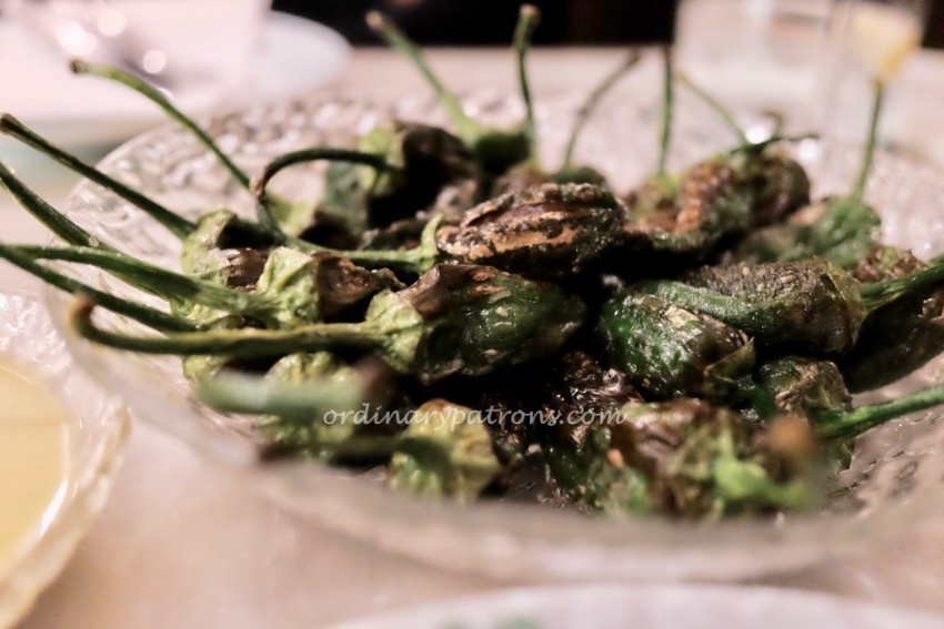 Our vegetable dish was fried padrón peppers with olive juice (8.5€). This was a big plate of small green peppers from the Spanish municipality of Padrón, in Galicia. They were tasty but not spicy. Served fried and with a dipping sauce of olive juice, which is a by-product from the making of the liquid olives.