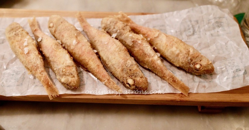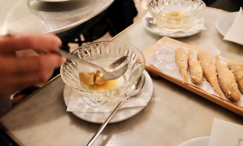 Our final dish was fried mullets (14.8€). Six baby mullets deep-fried and to be dipped into some artichoke and potato soup. This again reminded us of tempura. The mullets were fine and the meat was good, but because they are much bigger than anchovies, their bones are larger and did not fully disintegrate during the deep-frying.