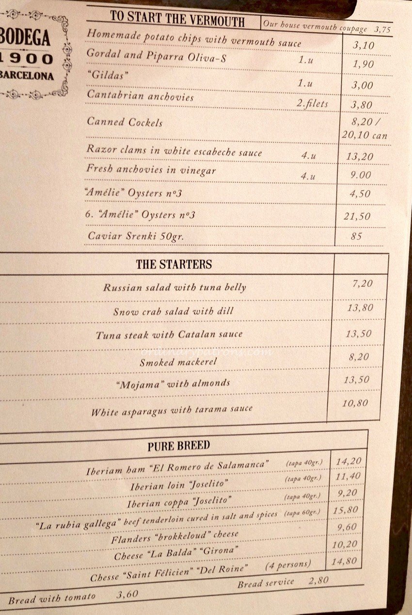 Here are pictures of the 2017 Bodegas 1900 Barcelona Menu. The list of items is short but there is a wide range, budget-wise. If the premium items are ordered, a meal can be a pricey affair, but if a normal selection is made, a meal in this illustrious restaurant need not be expensive.