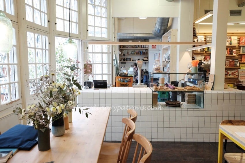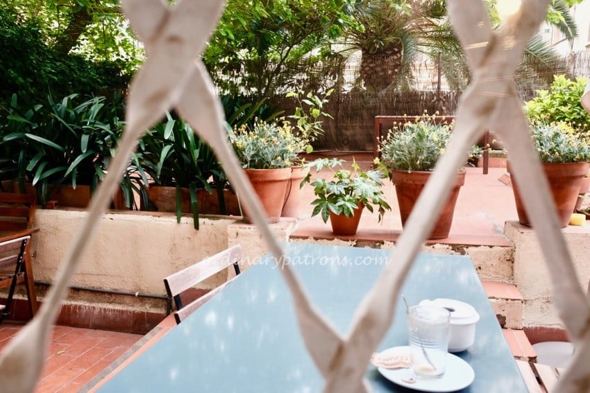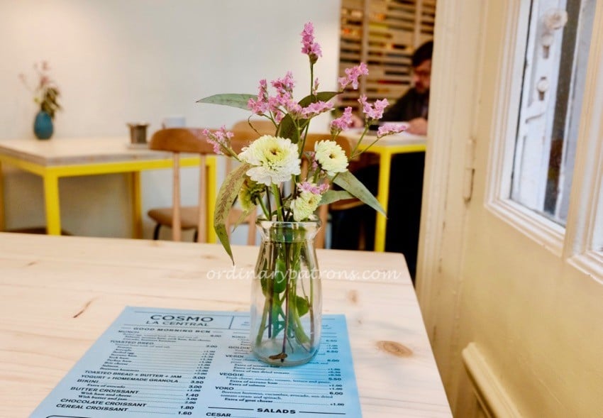 The Central Bookshop Cafe Barcelona takes up a small strip of space on the side of the upper floor. It is simply decorated. The crisp white natural lighting and the splashes of colour from the flowers were enough to brighten up the place. There is a small garden outside with a few more tables.
