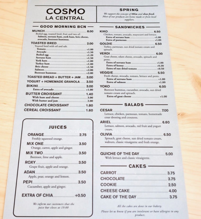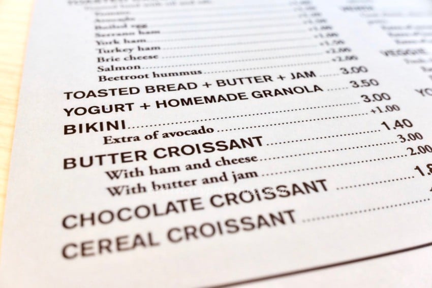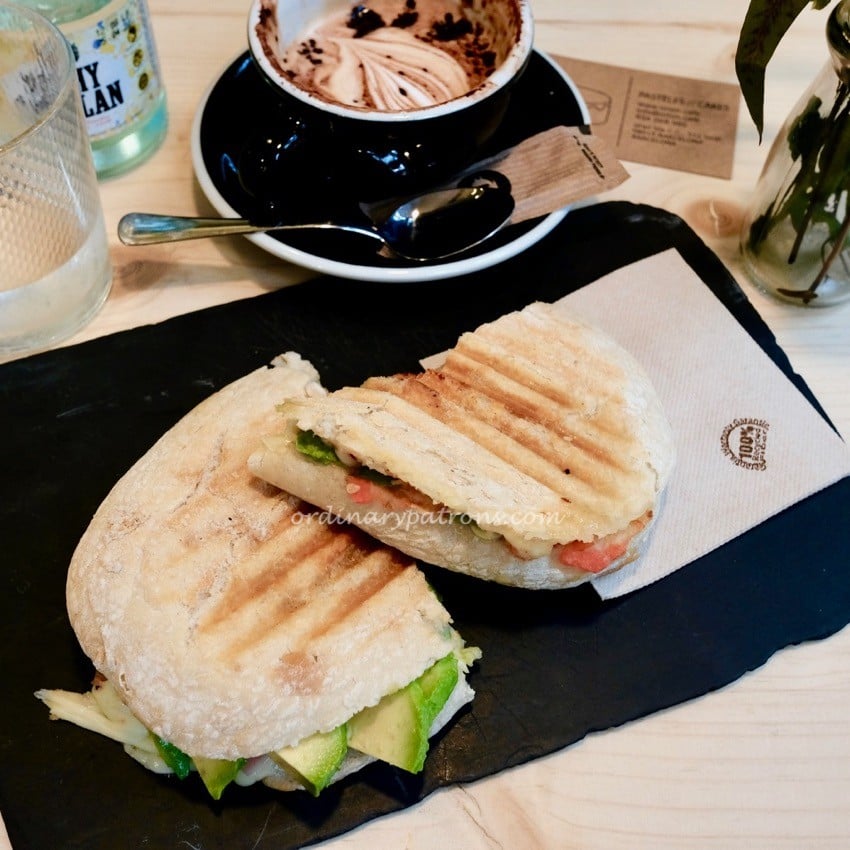 Here is a picture of the Cosmo La Central menu. Notice something? Everything costs 8€ or less. Our eyes were drawn to the Bikini (3€). It seems that toasted ham and cheese sandwich is known as a “Bikini” in Barcelona and possibly in Catalonia in general. We are probably not young enough to quality for the avocado generation, but we do love the buttery taste of the fruit. We decided to splurge and topped up our order with an extra of avocado (1€ ).