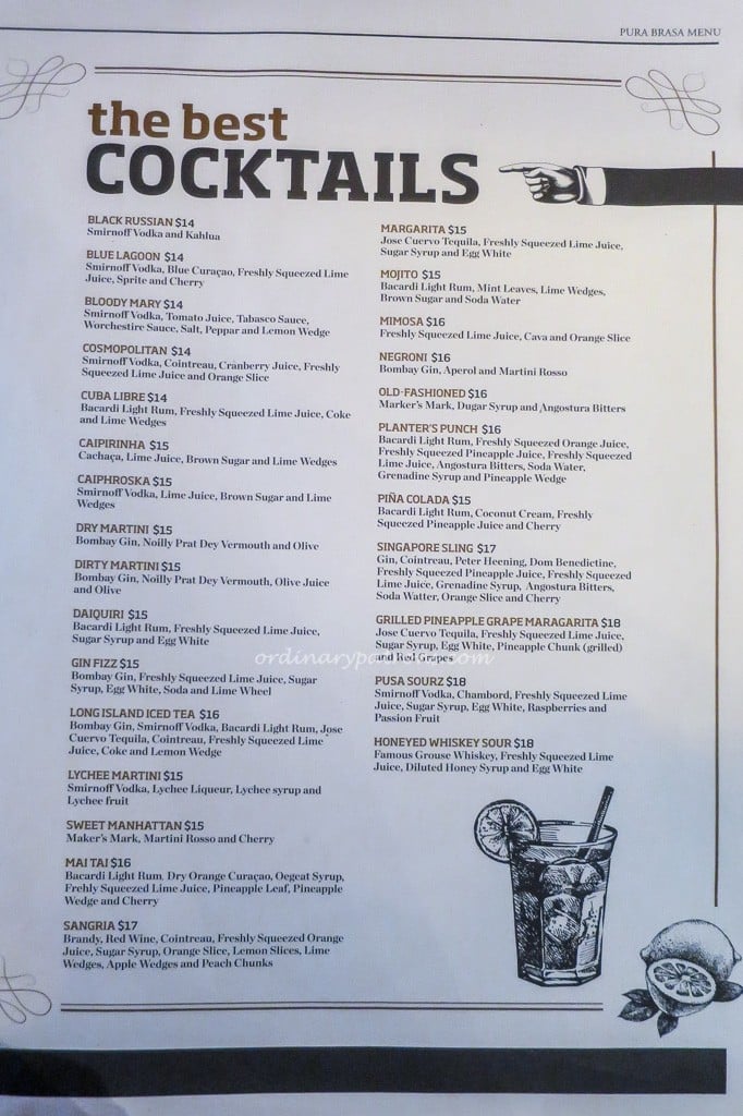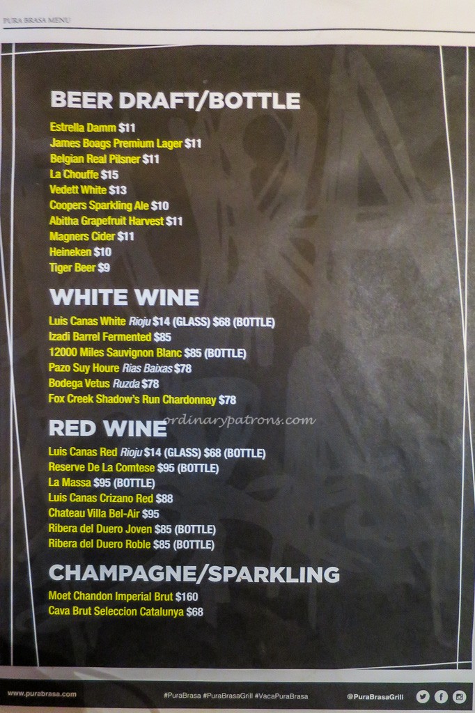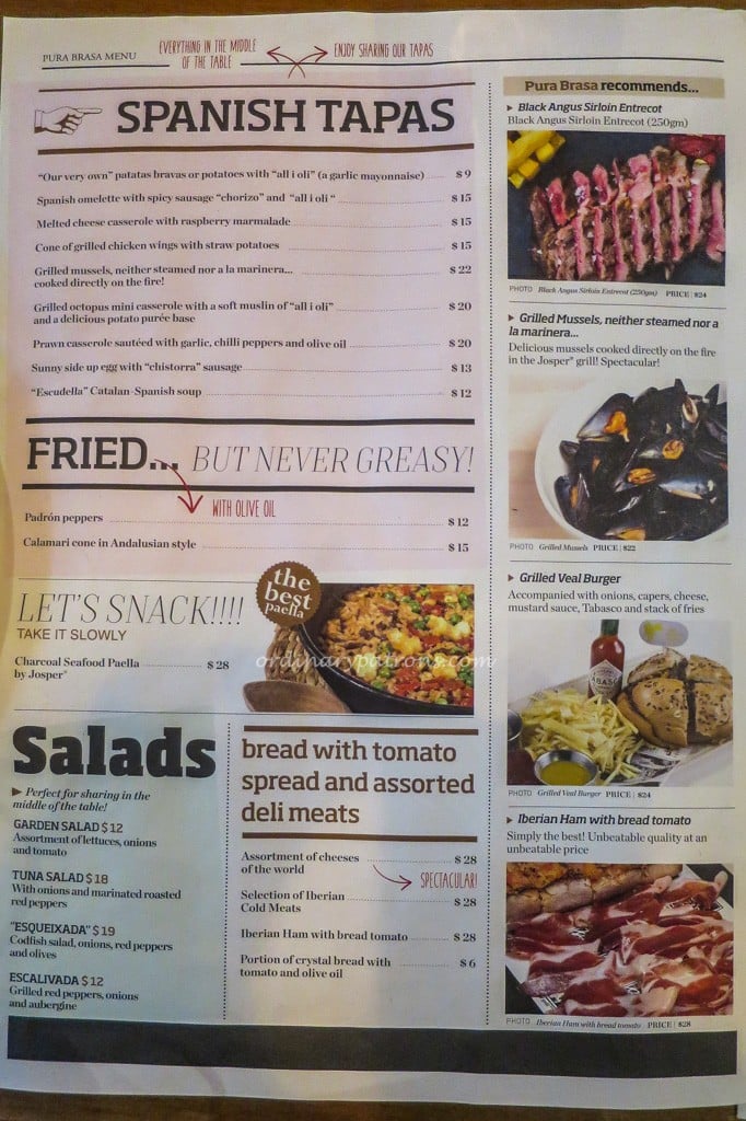 The Pura Brasa Singapore menu is quite extensive, ranging from Spanish staples like Iberian ham and paella to international items like pasta and burgers. Here are pictures of some pages from the food menu as well as the drinks list. The three course set lunch at $25.90 looks interesting. We tried a selection from different parts of the menu.