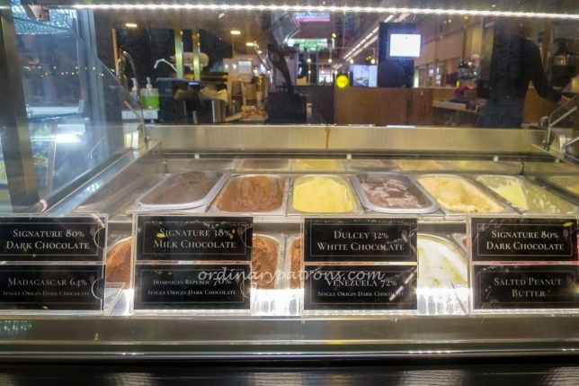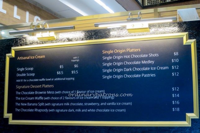 The Dark Gallery Menu contains a list of dessert items, mostly ice creams and various drinks. It is hard to imagine the items from the text. Better to go to the display and point. Plus, you can get to taste the ice cream before deciding. We ended up with a mix of ice-creams and a Single Origin Platter.