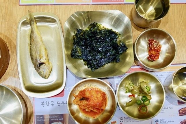 Some side dishes which come with the soontofu dish were served first. Â The small fish, seaweed and kimchi tasted good but the quantity was small. Â Eating the fish required surgical skills to pick at the flesh while avoiding the bones.