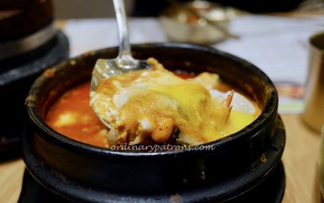 The seafood soontofu was served soon after. It was a boiling pot of soup, accompanied by a stoneware bowl of rice.