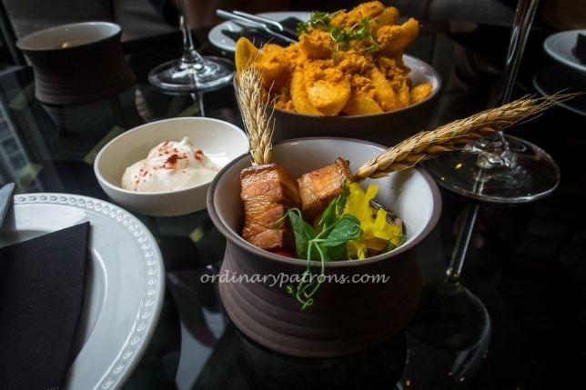 The food items that we had were the pork yakitori ($18) and crispy potato wedges with curried pork floss ($16). The pork yakitori was not the typical grilled yakitori. It was two small pieces of pork belly on sticks. At the bottom of the bowl was a small serving of cold soba noodles with the usual soy sauce dip. It was a very small portion but very beautifully presented and interesting.