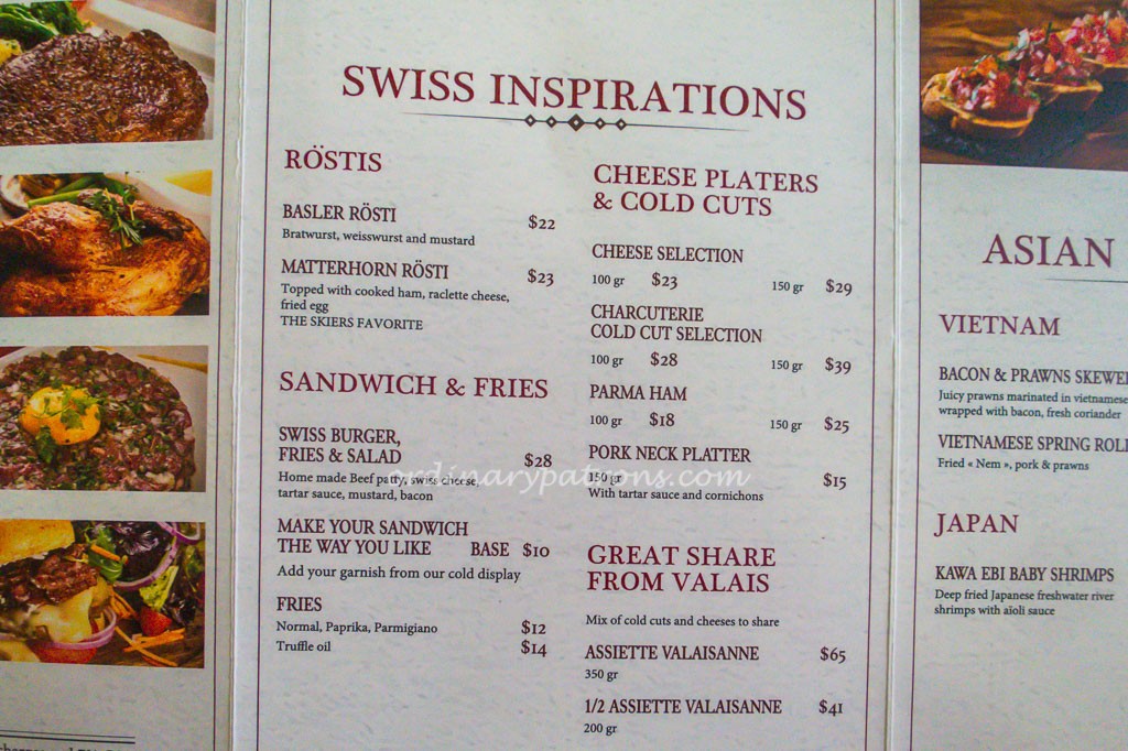 We tried a couple of Swiss food items – Raclette cheese ($13 for a single portion) and Matterhorn Rosti ($23). We were hoping that they would slice the Raclette in front of us, but that was not the case. The cheese had a strong smell, but the taste was more muted. The pickles help to balance out the taste. Eaten together with the pickles and potato, the Raclette was quite enjoyable.