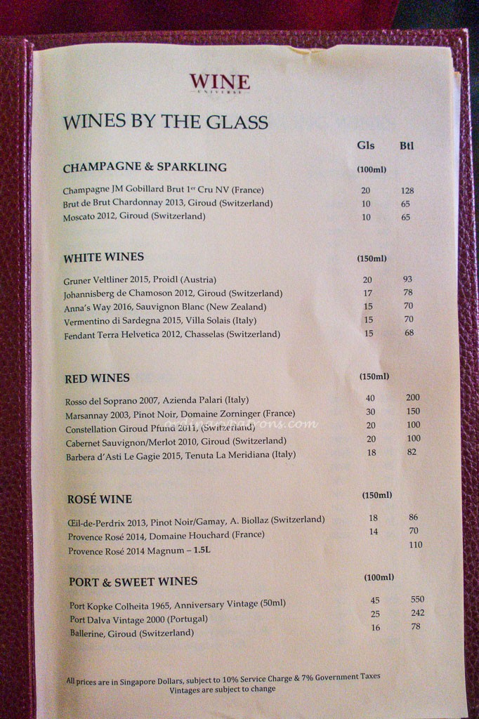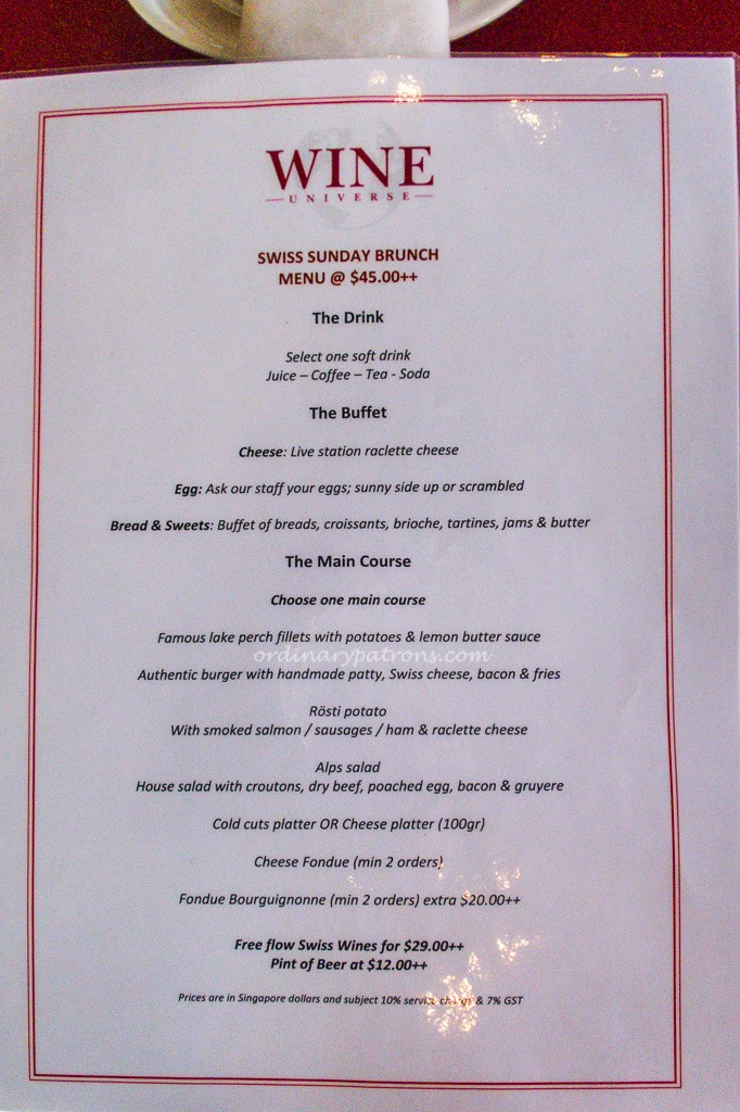 The menu ofย Wine Universe Millenia Walk Singapore contains a wide range of international cuisine, but the Swiss Inspirations section takes centre stage. Here are pictures of portions from the Wine Universe Menu as well as the Sunday Brunch menu.