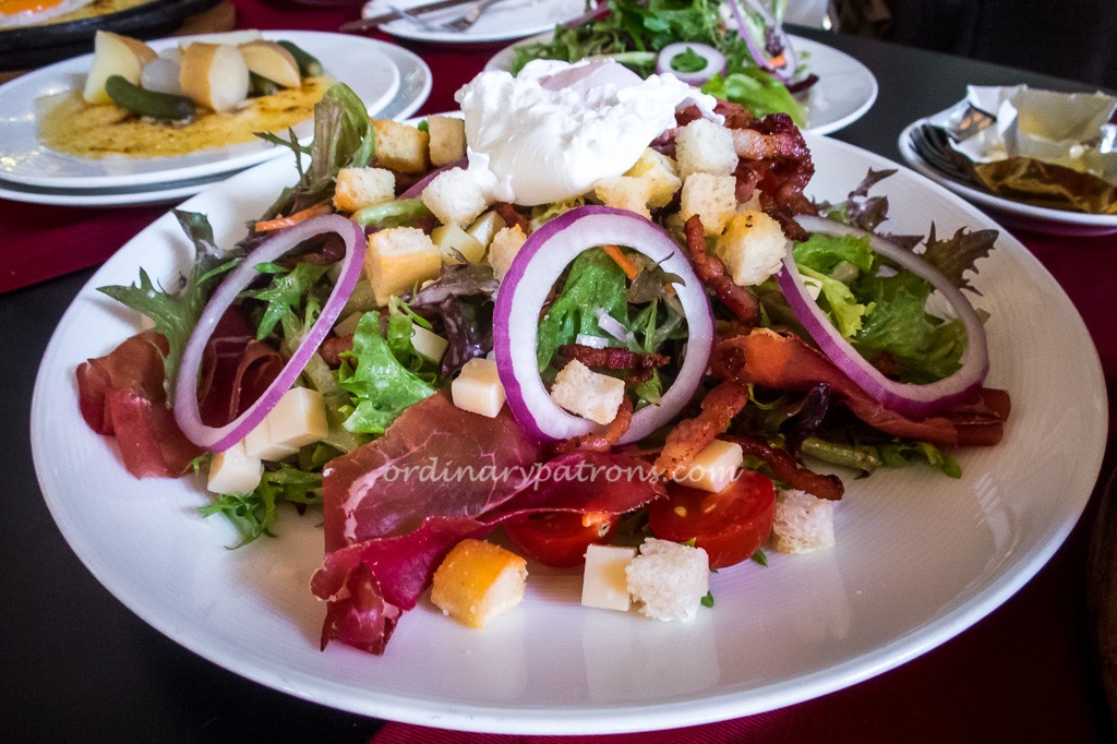 To balance the other heavy dishes, we had an Alpes Salad ($23). It was a huge portion of salad. ย It was made interesting by the presence of bits of cheese, bacon and thinly sliced dried beef.
